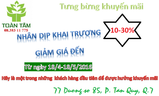 - Giảm giá từ 10 – 30% cho khách hàng tại quận 7 sử dụng các dịch vụ (bao gồm tất cả các dịch vụ) của công ty Toàn Tâm từ ngày 18/4/2016 – 18/5/2016.